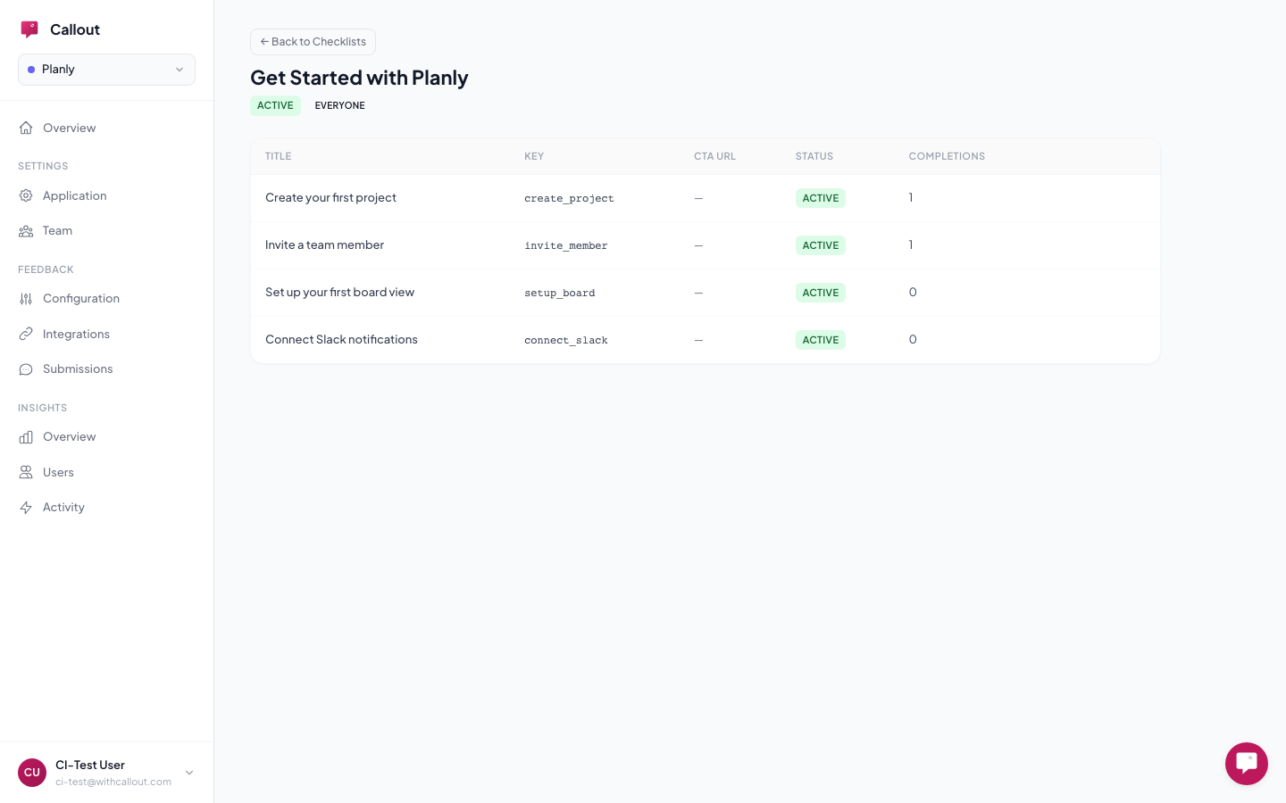 A checklist gives new users a clear path: here's what to do, here's your progress. Callout tracks completion per user and saves it across sessions — they pick up where they left off.
